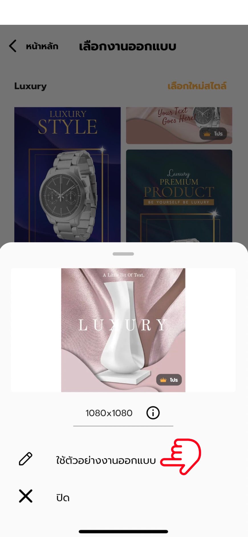 - เมื่อได้เทมเพลตที่ถูกใจแล้ว กดเทมเพลตที่ต้องการจากนั้นกดปุ่ม ใช้ตัวอย่างงานออกแบบ