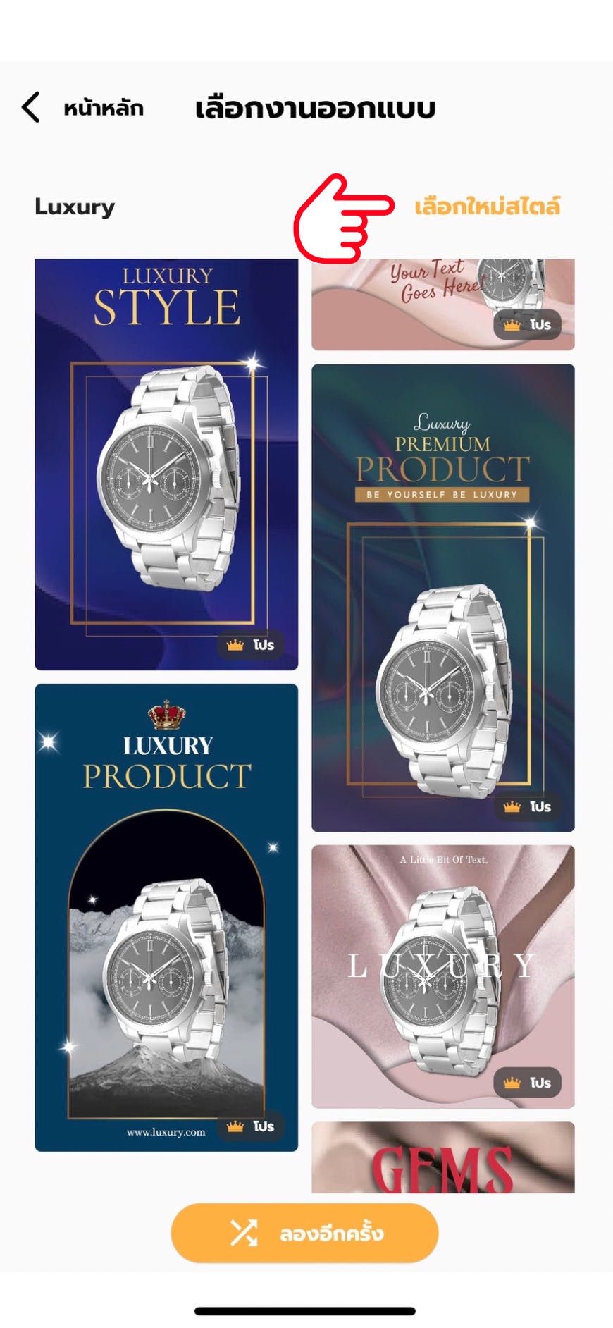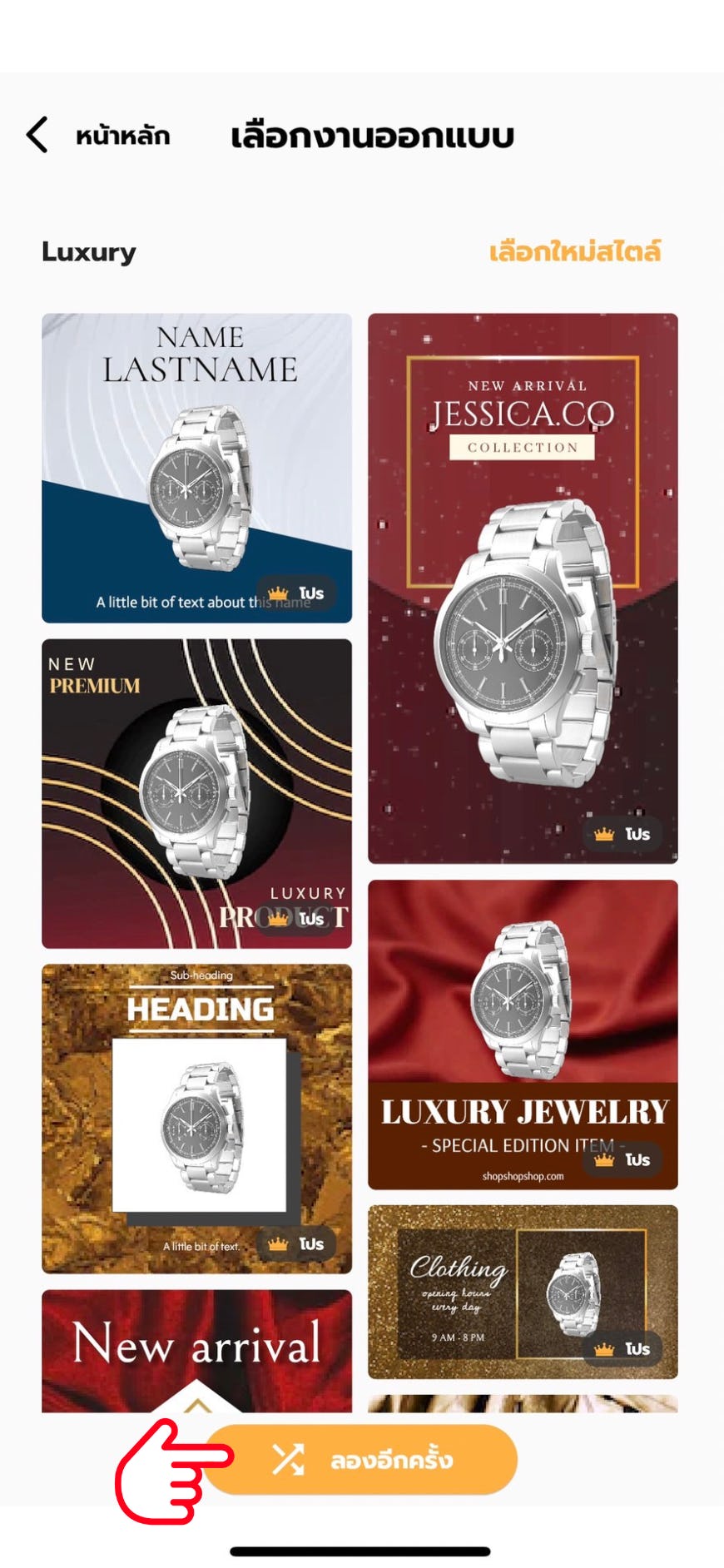 - AI จะสร้างรูปสินค้าและแสดงเทมเพลตพร้อมใช้งานหลากหลายรูปแบบบตามสไตล์ที่คุณได้เลือก หากต้องการดูเทมเพลตอื่นๆ อีก กดปุ่ม ลองอีกครั้ง