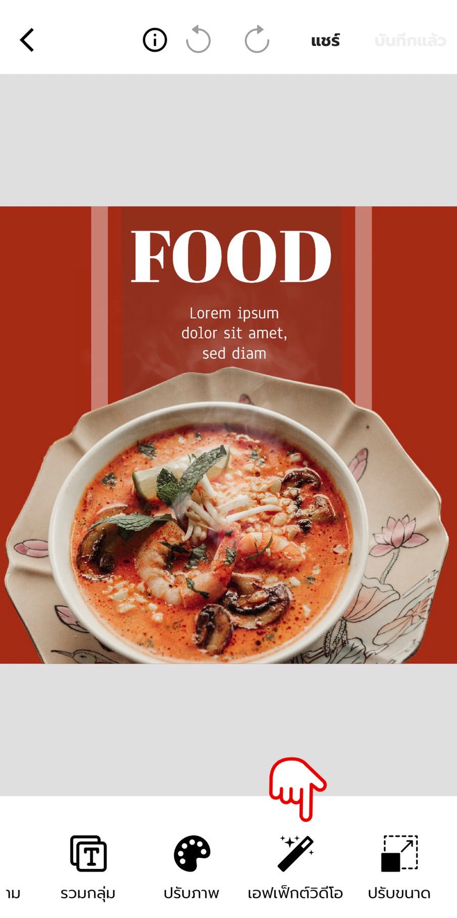 - กดปุ่ม เอฟเฟ็กต์วิดีโอ แล้วเลือกใส่เอฟเฟ็กต์วิดีโอสุดพิเศษของเราเพื่อสร้างอารมณ์และบรรยากาศที่ใช่ เหมาะสมกับทุกการใช้งาน