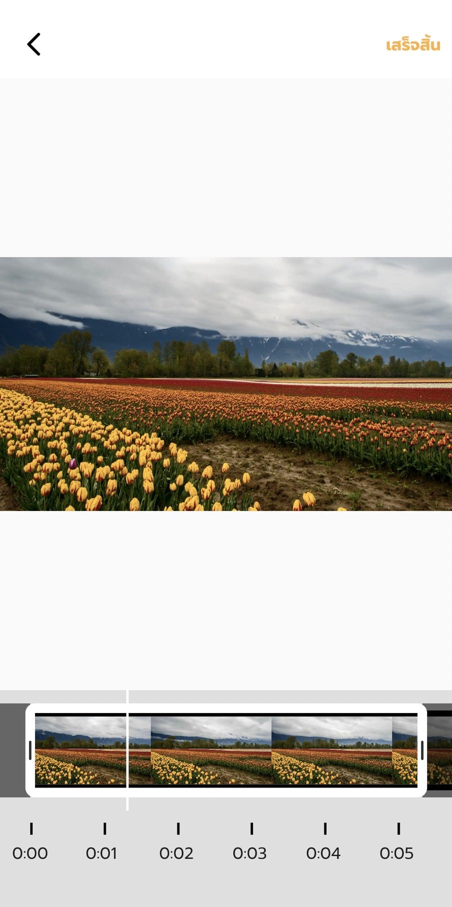 - เมื่อเลือกวิดีโอเสร็จแล้ว ระบบจะพาคุณมาที่หน้าต่างสำหรับทำการตัดวิดีโอ ดึงแถบด้านล่างไปทางซ้ายหรือขวาเพื่อเลือกช่วงในวิดีโอตามความเหมาะสม จากนั้นกด เสร็จสิ้น ขั้นตอนนี้อาจใช้เวลาในการบันทึก โปรดรอสักครู่