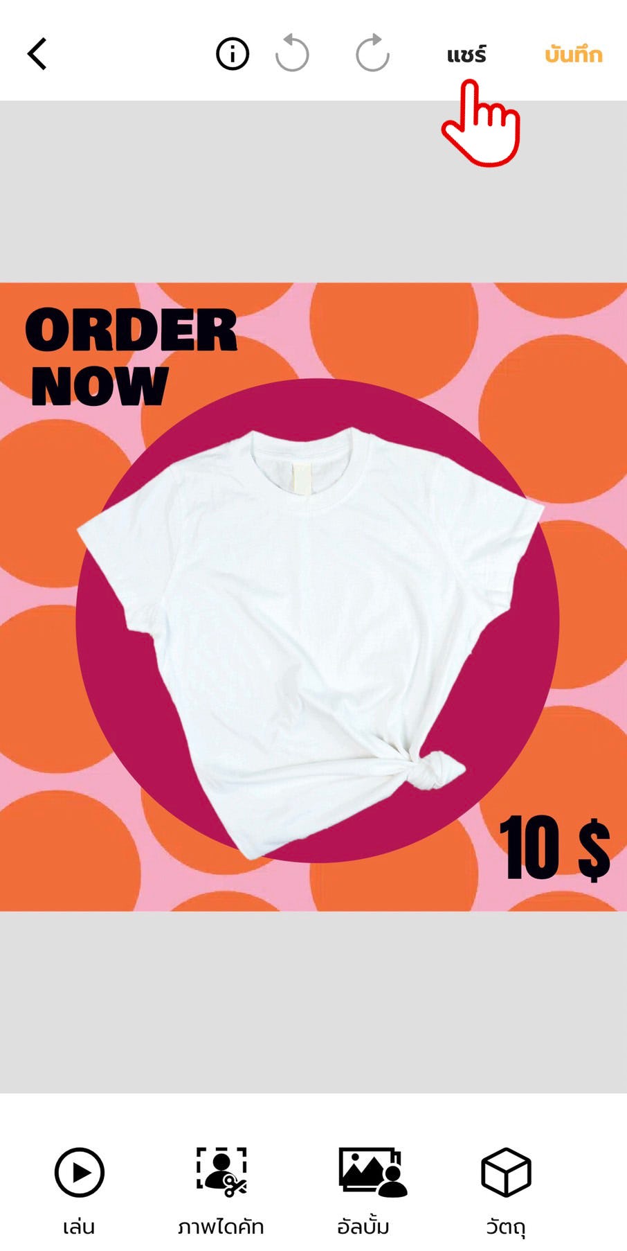 กดปุ่ม แชร์ เพื่อทำการแชร์หรือดาวน์โหลดผลงาน จากนั้นเลือกรูปแบบไฟล์ได้ตามต้องการ (*เฉพาะสมาชิกแบบโปรเท่านั้นที่สามารถแชร์แอนิเมชันแบบ mp4)